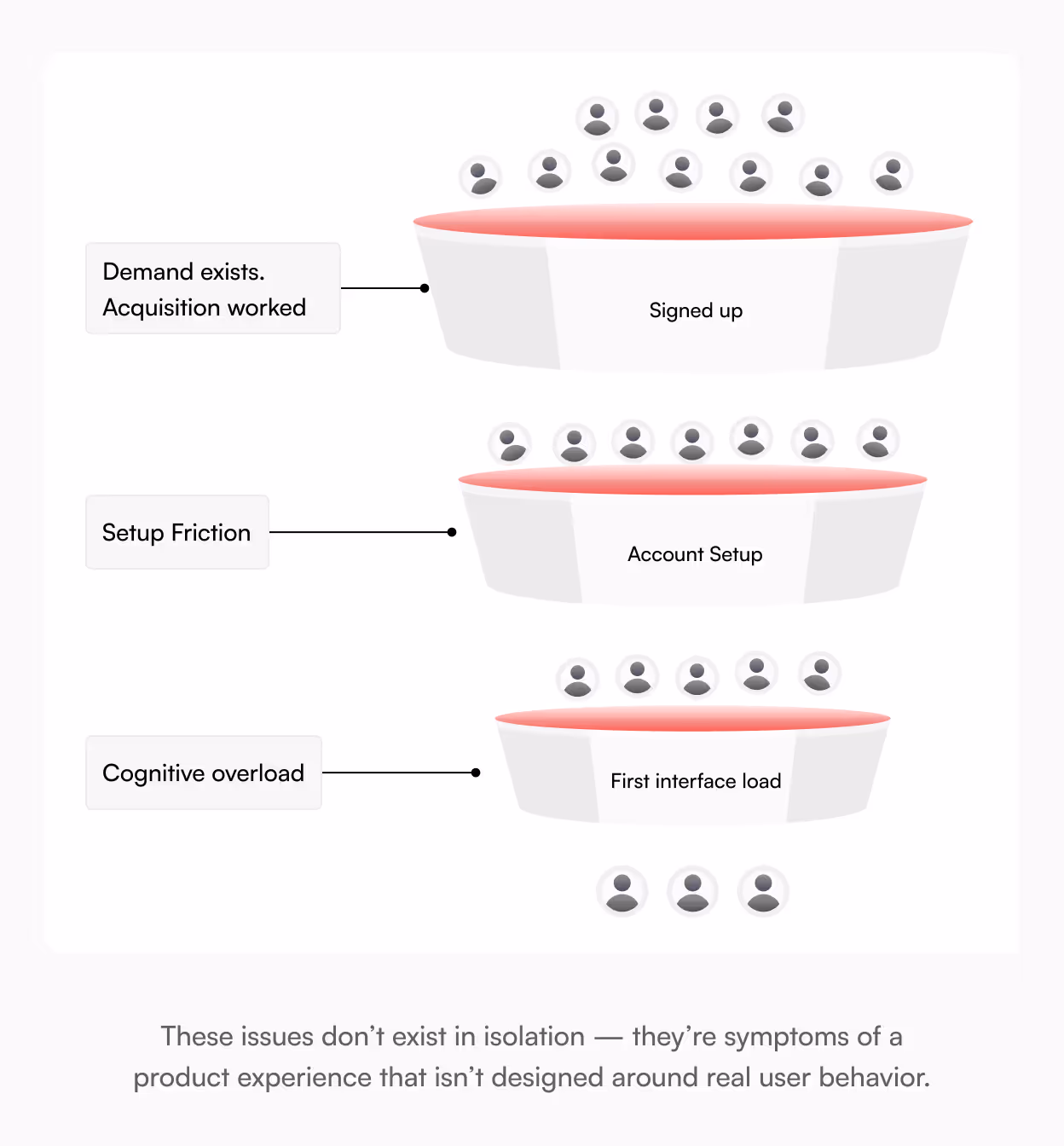 Confusing flows and misaligned experiences lead users to disengage before habits are formed.